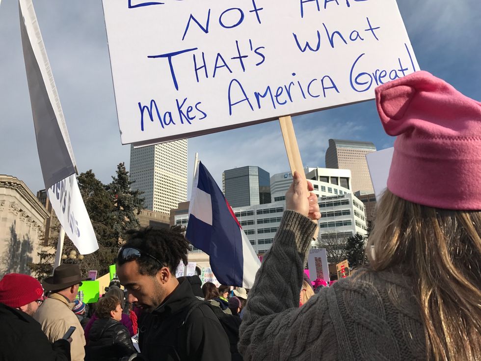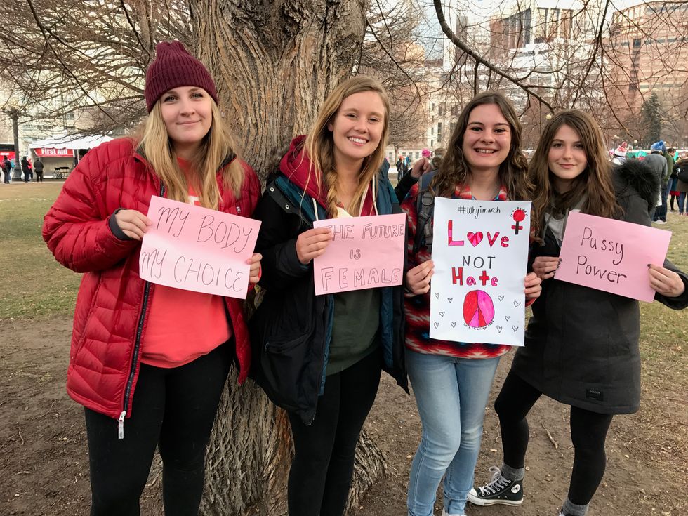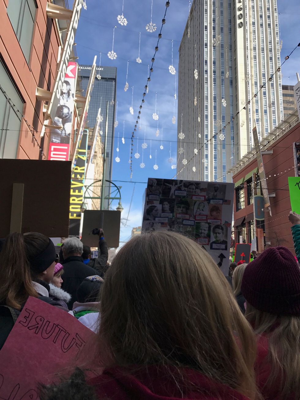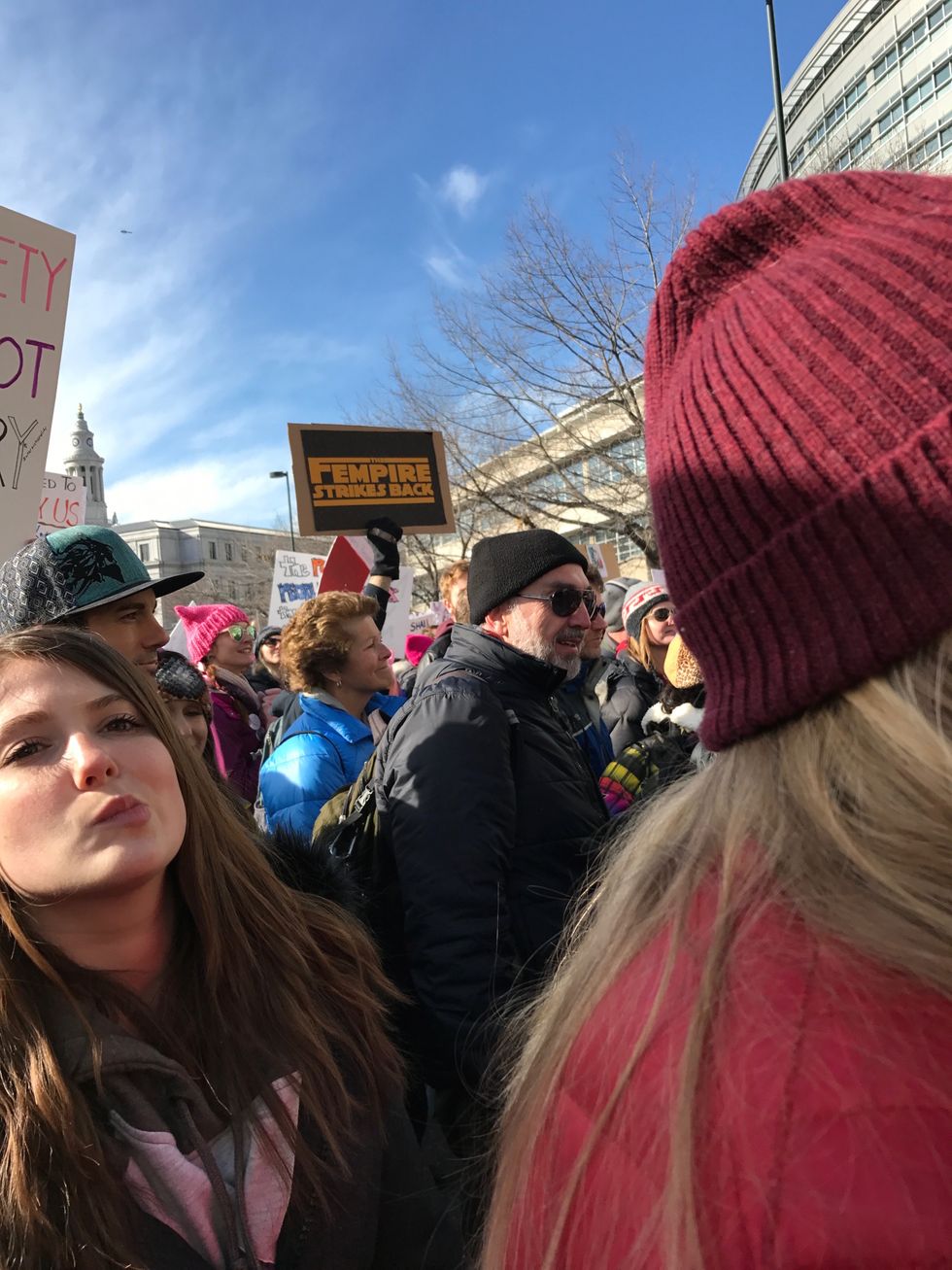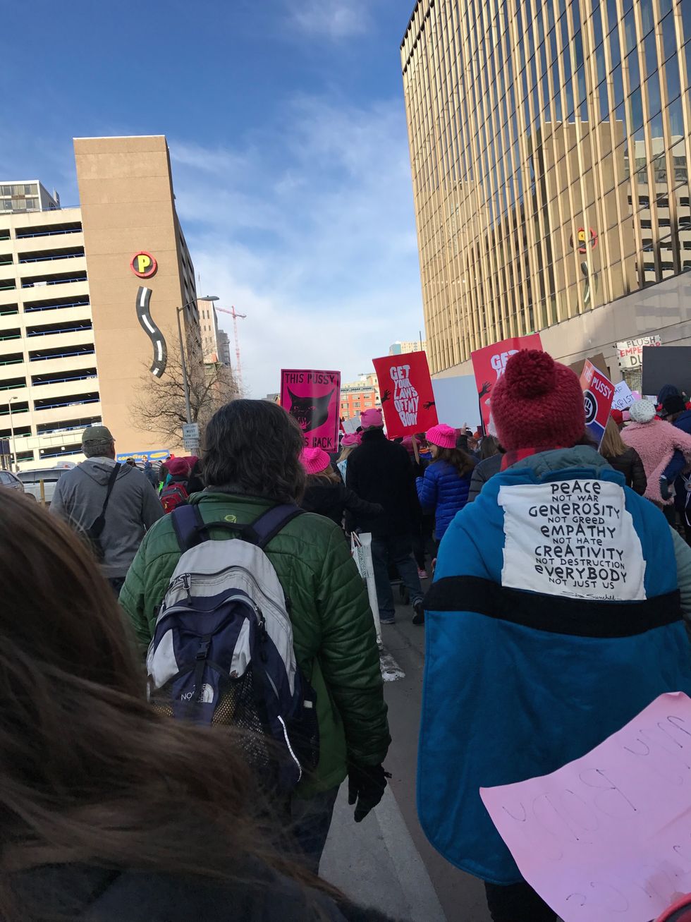 We made our way through the arch at Civic Center Park, and found ourselves on the roads downtown. There were people finishing the march when we were just beginning, which speaks volumes about the massive size of this event. We walked in a sea of people of all races, genders, ages, and abilities. Some of the powerful supporters I witnessed included an older man in a Veterans hat, seven year old boys chanting for equal rights for their sisters, and of course countless women in pussy hats, making me wish I had gotten one myself.