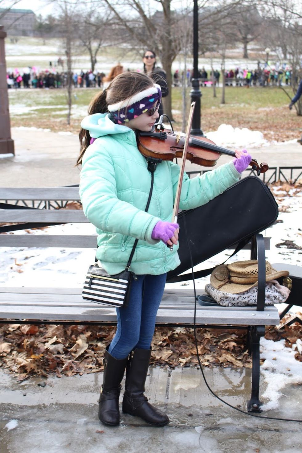 I marched alongside my mom, my family friend, and thousands of other strong and beautiful women. I was delighted to see a large number of men and boys in attendance as well. People of all ages came together, and it was a magical sight. We marched up from the lawn, out onto the sidewalk. There were honks of support from cars passing, many on their way to the UConn basketball game happening nearby. People from their apartments waved as we passed. We came across many inspiring souls along the way. There were strong women leading the march in empowering chants. There were children holding signs along side their moms, dads, and siblings. There was one young girl serenading the marchers with beautiful violin music. We marched under Memorial Bridge and headed uphill toward the capitol building, where all the marchers gathered at the end of their walk.