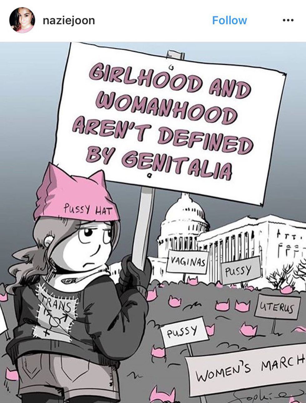 My friend and I noticed that several white women were wearing pink beanies that were sort of shaped as cat ears. These beanies were a representation of a pussy. The problem with wearing that sort of beanie is that it is excluding trans womyn. Wearing this beanie and just having a march centered on vaginas is leaving our trans womyn without a voice. It is not acknowledging their struggle and we need to get rid of the idea that having a vagina makes you a woman. Women hood is more than physiology.