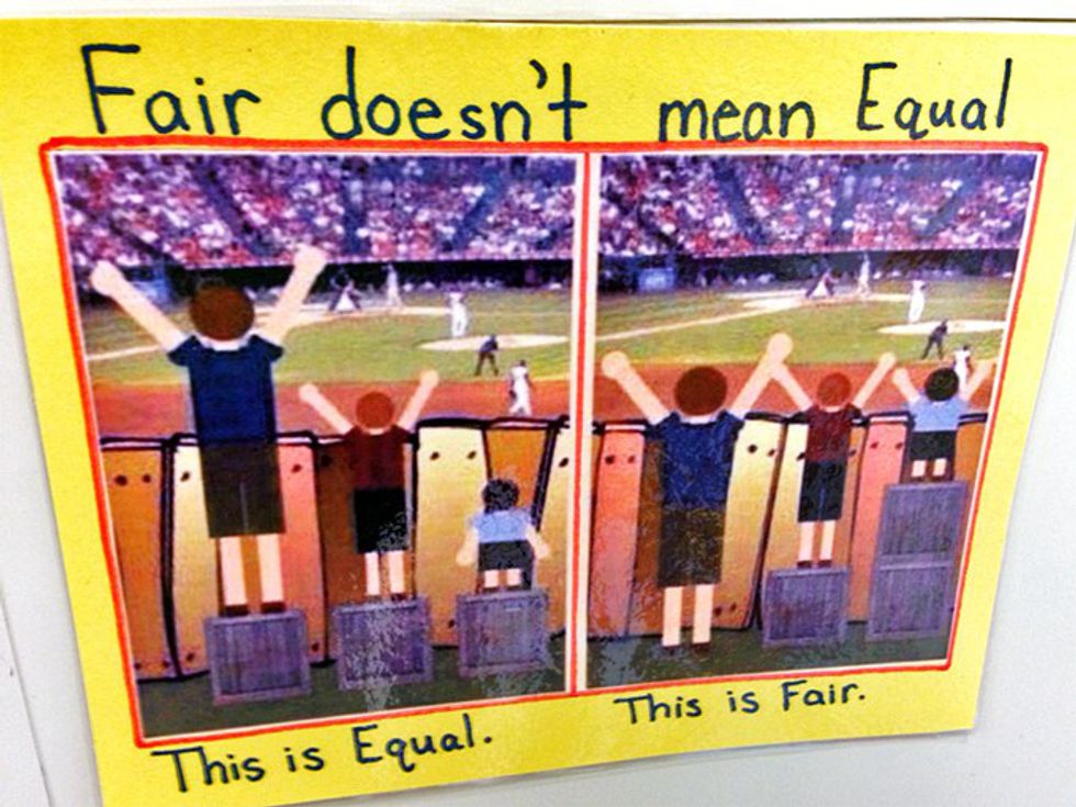 You say society changes the meaning of "fair" when it comes to minorities, but that just isn't true. I think you are confusing the meanings of equal and fair. Here is a handy graphic to sort out the difference!