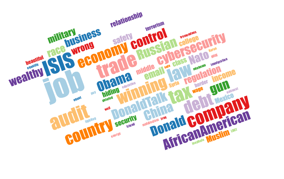 So a couple things here stuck out to me. So any variation of the word "jobs(s)" came in the most, around 44 words, according to my tallies. After that, the conversation continued to focus mainly on the economy, bringing companies back home, how different tax rates would do that, and, of course, how Donald Trump has been a job creator his whole life. Variations of winning came in high, as did references to ISIS. DonaldTalk represents every time to talked about himself, a little under 12 times. The African American community and gun control were brought up quite a bit.