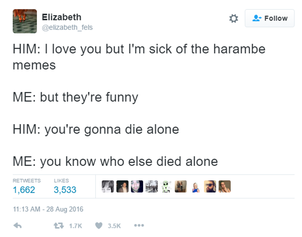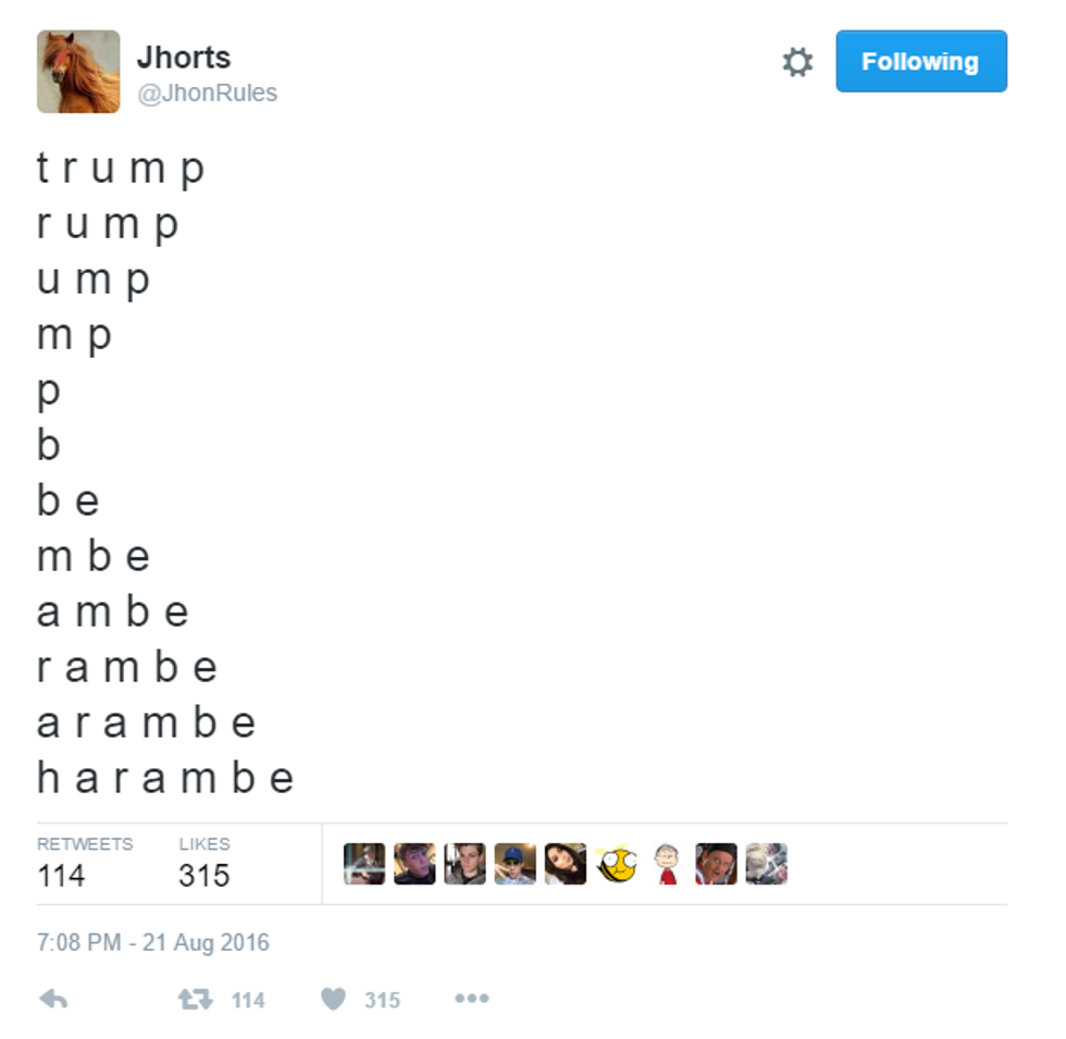 True humor took over the raw anger and release of stress pulsing through the Harambe movement. Excellently sharp jabs and cutting ripostes are the norm for Harambe fans now, and it’s a sure improvement over the brusque vulgarity of “dicks out for Harambe.”