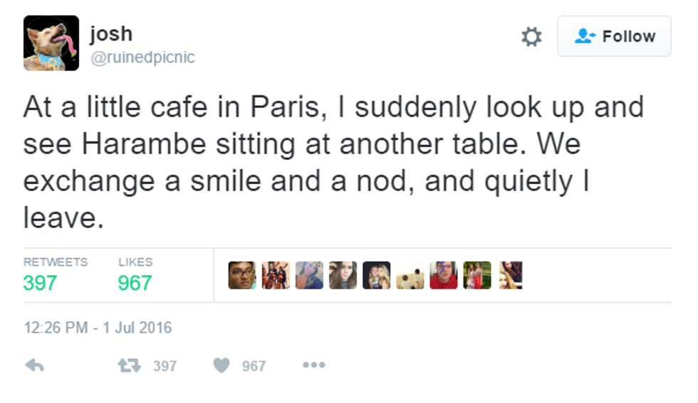 The level of Harambe jokes that have arisen in the months since his death are on a new level—far above that of “dicks” being “out.” These jokes have wandered into the land of tasteful wit, amusing puns, and cross-cultural references that make jokes truly funny.