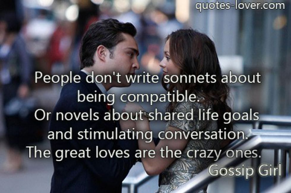 “People don’t write sonnets about being compatible or novels about shared life goals and stimulating conversation. The great loves are the crazy ones.”