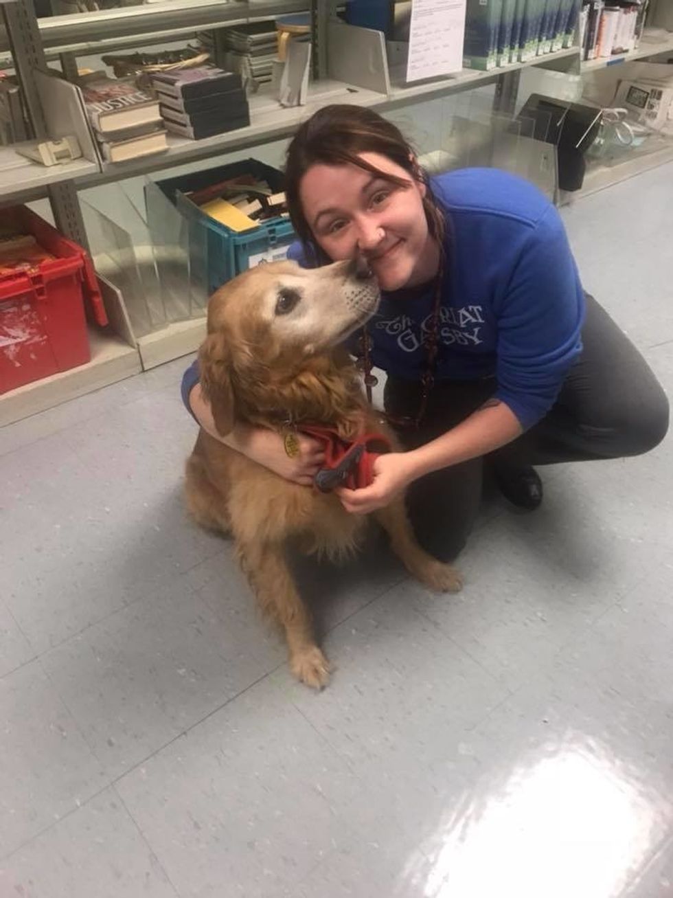 The dog pictured with me here is named Layla. She is part of a program we offer at the library called Tales to Tails. It is a program where anyone, especially children, is welcome to practice their reading while reading to a therapy dog. Working at the library gives you plenty of time to hang out with these adorable pups!