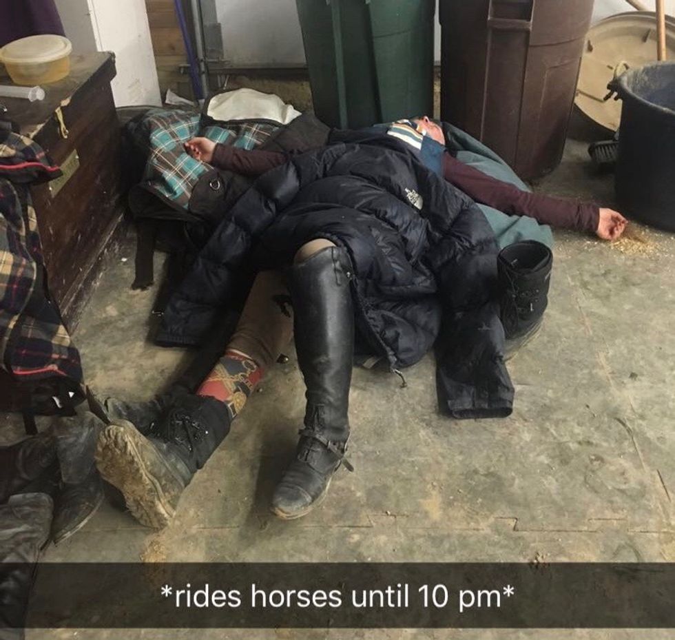 Stop, drop and go to the barn. This really means that you need to be able to drop whatever you’re doing and go to work. Chances are your trainer won’t text you a start time until 30 minutes before she wants you to be there. Forget your social life because who needs that? School? That’s a waste of time. Occasional 12-hour work days? Forget labor laws.