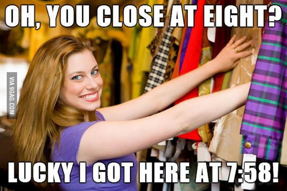 To the customers who stay after we close for over ten minutes, yes. Yes we are annoyed with you and want to finish closing so we can get home. We want to get out of here and quit saying that we close at a different time. We don't care if you say that you are getting only one thing. Meanwhile, you ask for quarter pounds of both lunch meats and cheeses. Standing at the door when we close asking to come in will not get us to let you in. Once at my place of work, a man ran in the store after we were closed. The door was open to get the buggies outside. We were about to leave when this happened. The man was forced to leave. This was an hour after we closed. Another time when I was helping the produce department with closing, I was standing by the door at a display. A women was mad that I would not let her in. I told her to come the next day but she wasn't happy.