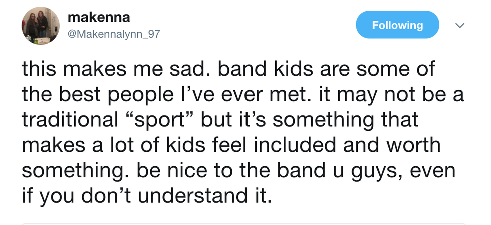 Band gave me my people. In college, I was so nervous to basically start over. I attend a school 600 miles away from home. Though, I'm a relatively friendly person. I make friends fairly easily and am blessed to be friends with a large chunk of a 400+ person band program.