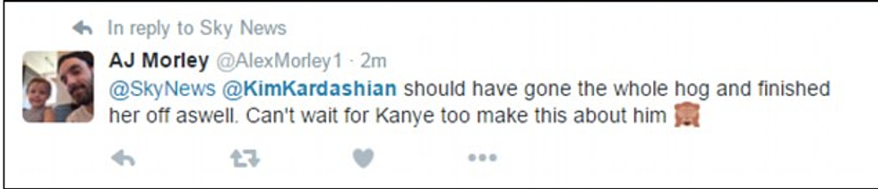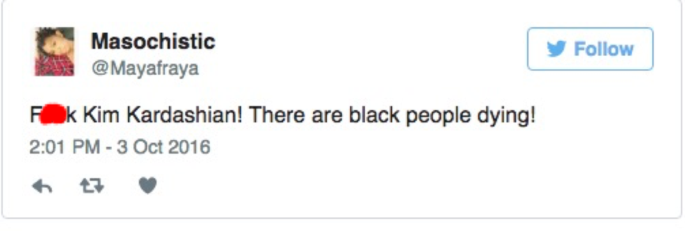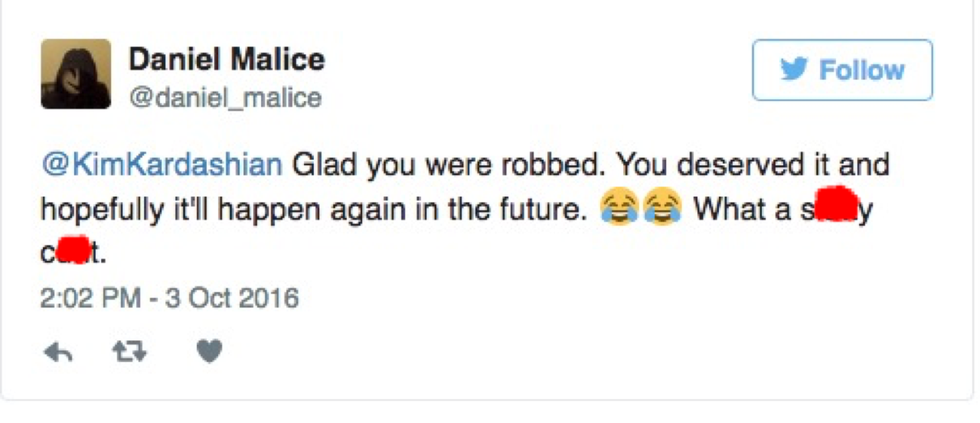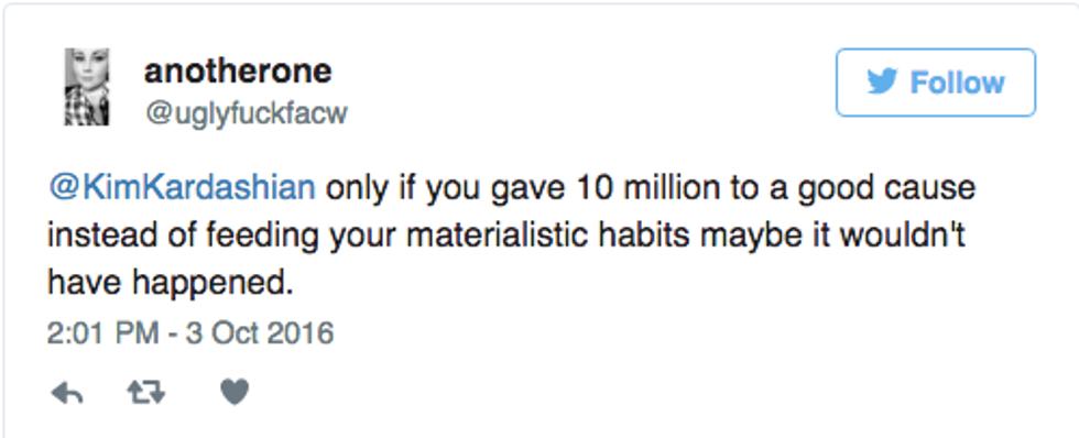 There were even tweets mad at her husband Kanye West, for leaving in the middle of his live show in Queens. Fans expected Kanye to continue on with his show just after hearing the news his wife was held at gunpoint. A lot of the "why does she even have that much jewelry with her in the first place?" tweets continue the victim blame game that society does whenever a woman is attacked. People's first thought went to finding Kim at fault rather than asking if she or her two young children were harmed. These tweets were so brutal it makes me wonder what Kim Kardashian has done to even deserve this type of wrath? These tweets say a lot about where we're at as a society and how desensitized we are towards not only violence but violence towards women.