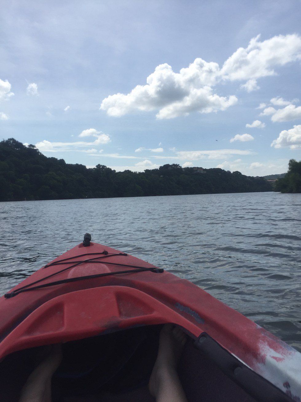 I went kayaking in Austin, Texas this weekend with my boyfriend. We were on the river right by downtown. I put my swim suit on, applied sunscreen, got a life jacket and was out on the water. I was in a red, white, and blue kayak and had a white paddle. The second I pushed off the dock and was officially kayaking I had the biggest smile on my face.