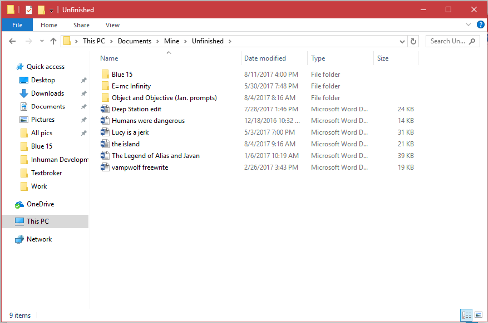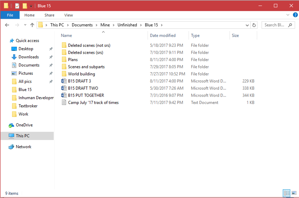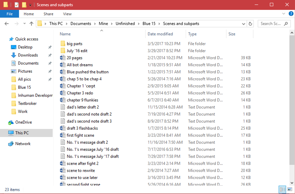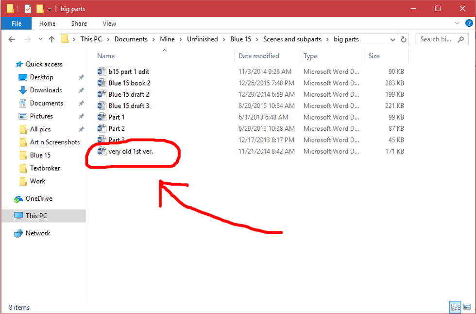 Okay, but really, that wasn't too bad. Sure, I've got a lot of documents, but so what? It's a way to stay organized. The last thing I'd want to do is lose treasured parts of my book that I wanted to save from the very beginning. It'd be fun to go back and read the very first draft someday, wouldn't it? I wonder where we would find that...