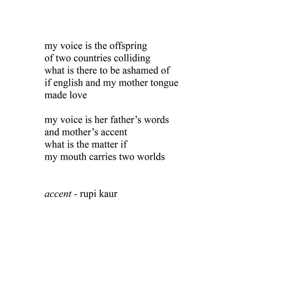 The issues of having immigrant parents, being a woman of color, and the problem the world has with accents, are what I deeply connect to the most. I am the child of immigrant parents, I have brown skin, and my parents have thick accents. Rupi Kaur's poems target all of these issues with eloquence and fill me with hope, confidence, and most importantly, with being thankful and proud of my roots, my mother and father, my skin color, and being a women.