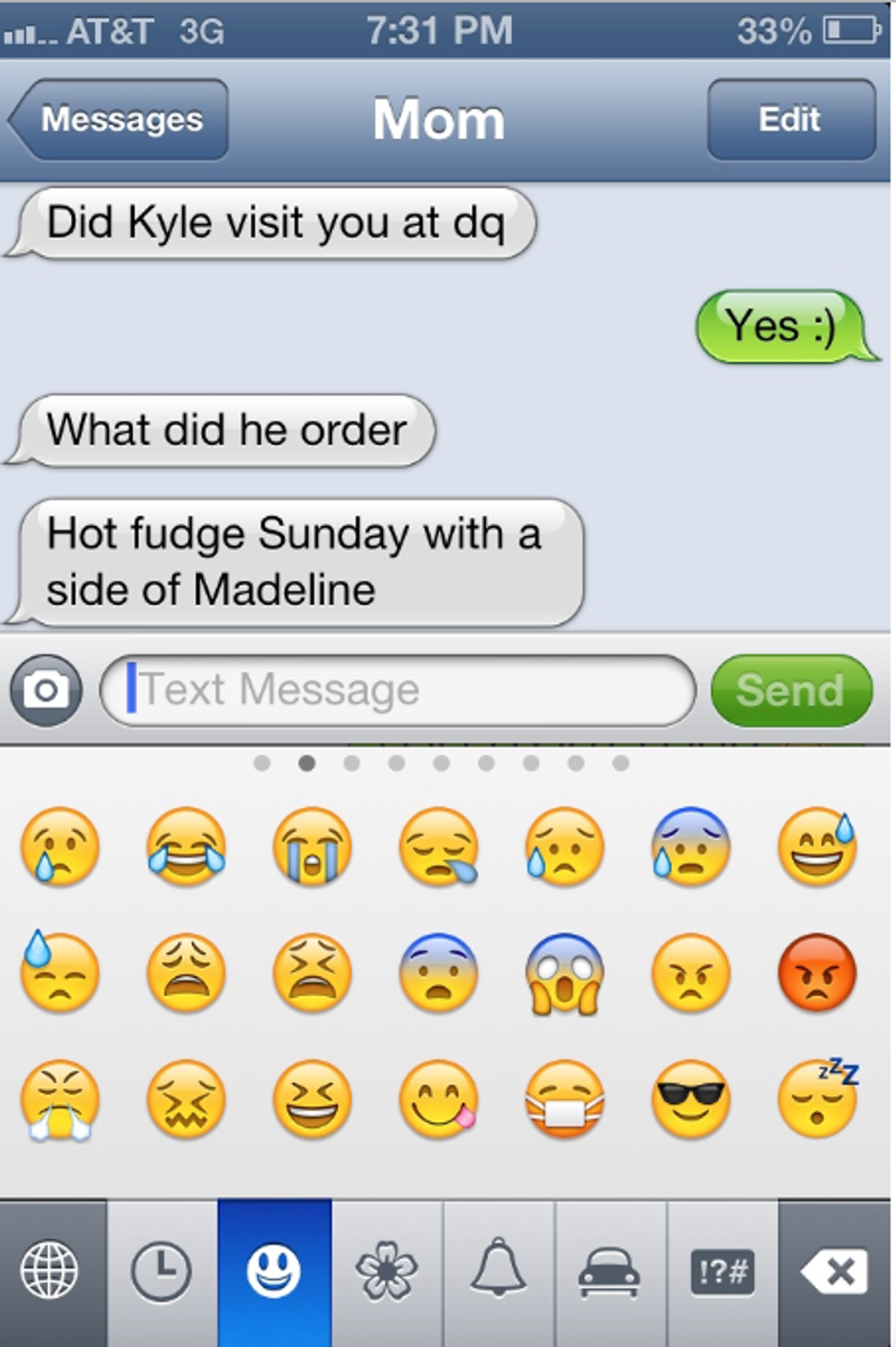 In high school, my first job was working at the local Dairy Queen. I was experiencing a lot of other firsts at this time, including the first time I ever told my mom about a guy I had a crush on. Needless to say after I got this text, I never updated her on guys again.