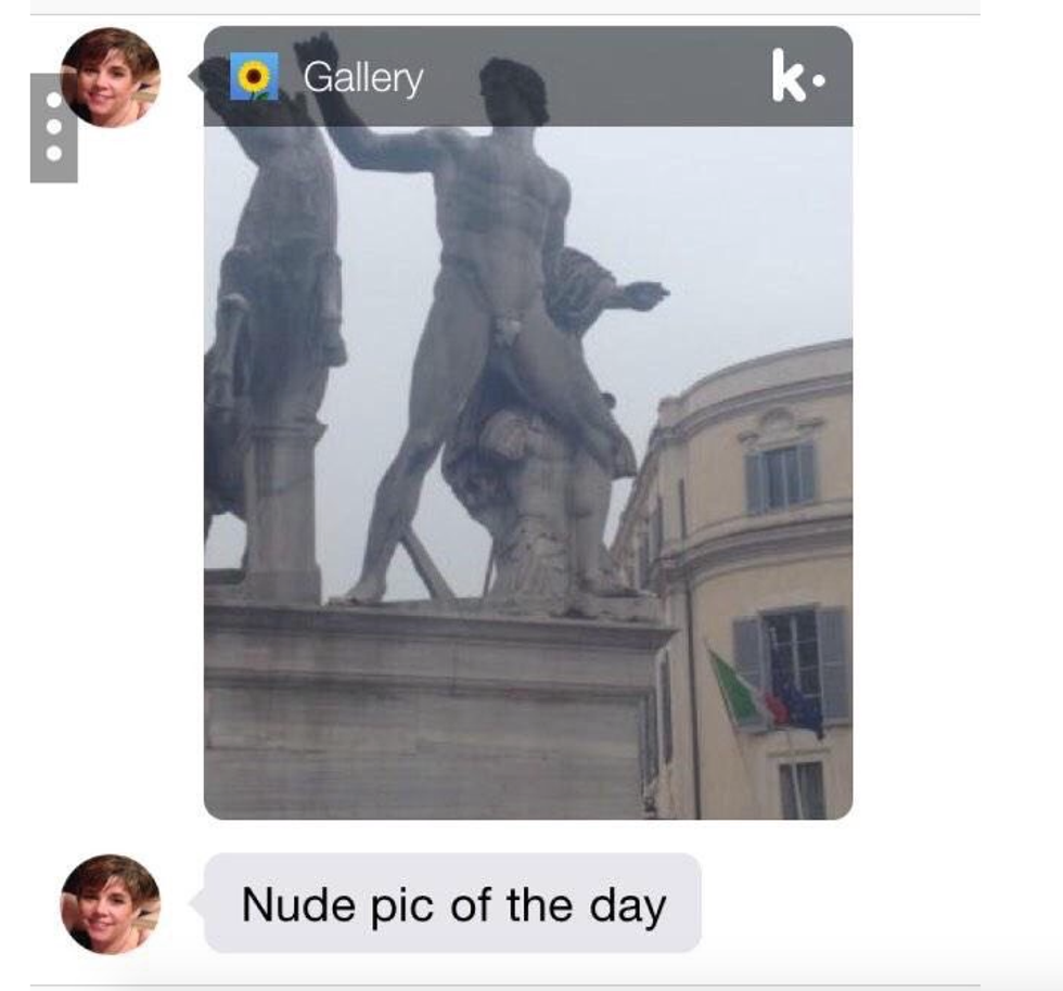 And of course, saving the best for last, this KIK chat. A fellow writer needed to use KIK to contact her mom while she was abroad and couldn't use her cell phone service. She told her mother that "most people get KIK to send nudes." So naturally, her mom started sending her nudes.