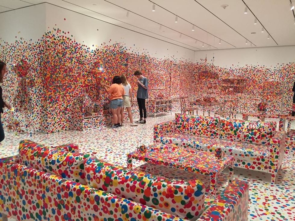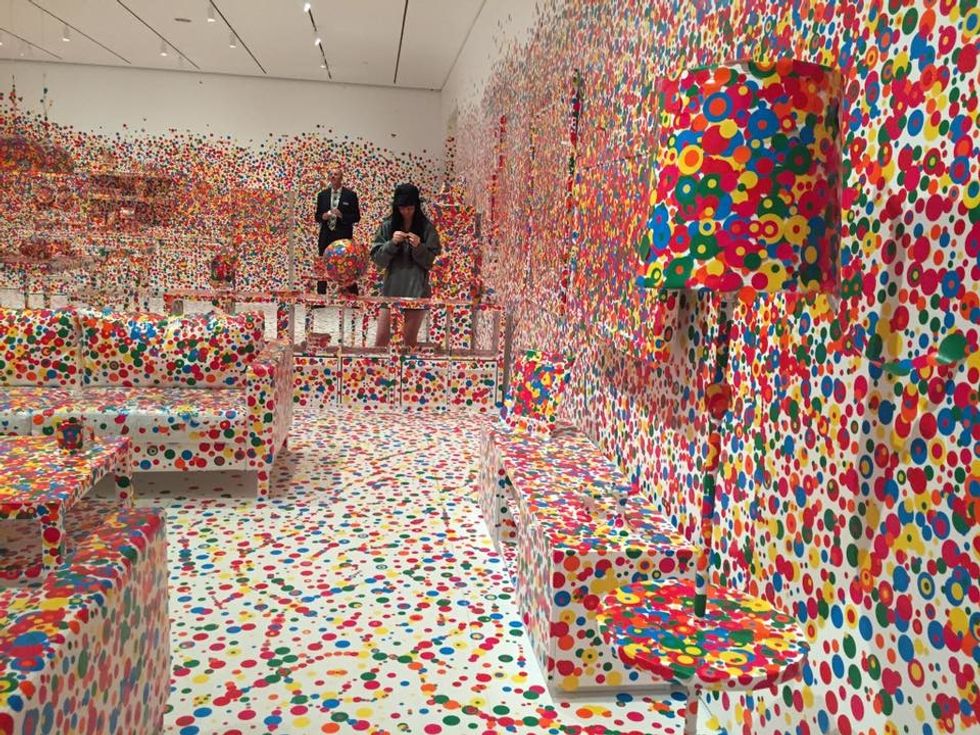 I wasn't allowed to take a picture of the sixth room either, but this gentleman below has done us the honor of sharing what "All The Eternal Love I Have For The Pumpkins" looks like from the inside. Created in 2016, this room explores Kusama's fascination with kabochas, which are Japanese pumpkins. The exhibit explained that Kusama became fascinated with pumpkins when one spoke to her as a child. To Kusama, pumpkins radiate energy and Kusama's childhood and alter ego.