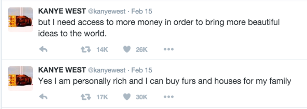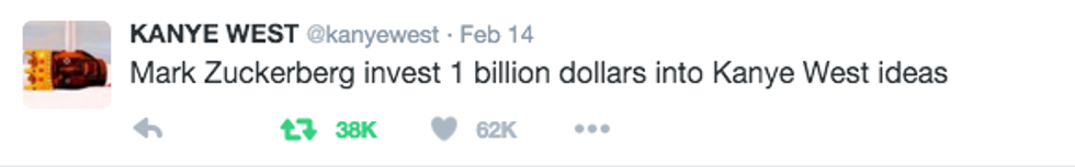 Kanye is clearly desperate enough for money that he is willing to publicly ask Mark Zuckerberg to give him one billion dollars. However, isn't it ironic that Zuckerberg owns Facebook and Yeezy is tweeting about needing the money?Perhaps he would have been more successful is he asked Zuckerberg on the website he owns. Also, what are these "Kanye West ideas?" Is he going to invent ways to help solve the world's problems? Isn't it funny how Kanye initially says that he is 53 million dollars in debt, but then he asks Zuckerberg for one billion dollars?