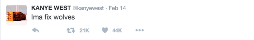 Obviously one of Kanye's great ideas is to fix wolves. Maybe he will become a "Wolf Whisperer" and train wolves to be good household pets? I'm all for fixing wolves if they will help our world be a better place. Perhaps Kanye was tweeting about one of the new songs called "Wolves?" The world may never know. Maybe this will be his campaign slogan in 2020?