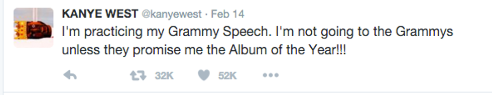 Kanye's tweets reached a whole new level of craziness when he tweeted that he expected to win "Album of the Year." First of all, Kanye was not nominated for any Grammy awards this year, but that didn't matter to him. Since Kanye claimed that "The Life of Pablo" is "album of the life," he probably assumed he would be honored at the Grammys. The fact that the Grammy nominations came out in December and he tweeted this on the day of the Grammys probably did not matter to him.