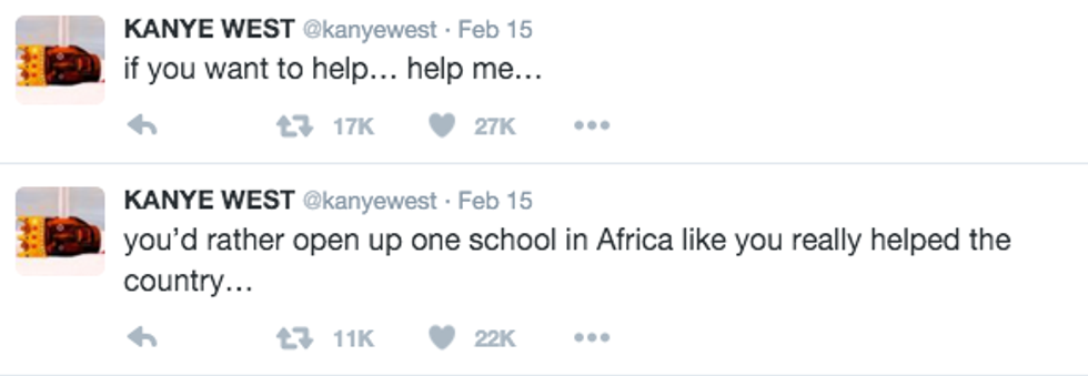 Kanye later tweets saying that instead of helping uneducated children in Africa, we should be giving our money to him. Unless Kanye is about to solve world hunger, I'm going to stick with helping children receive an education.