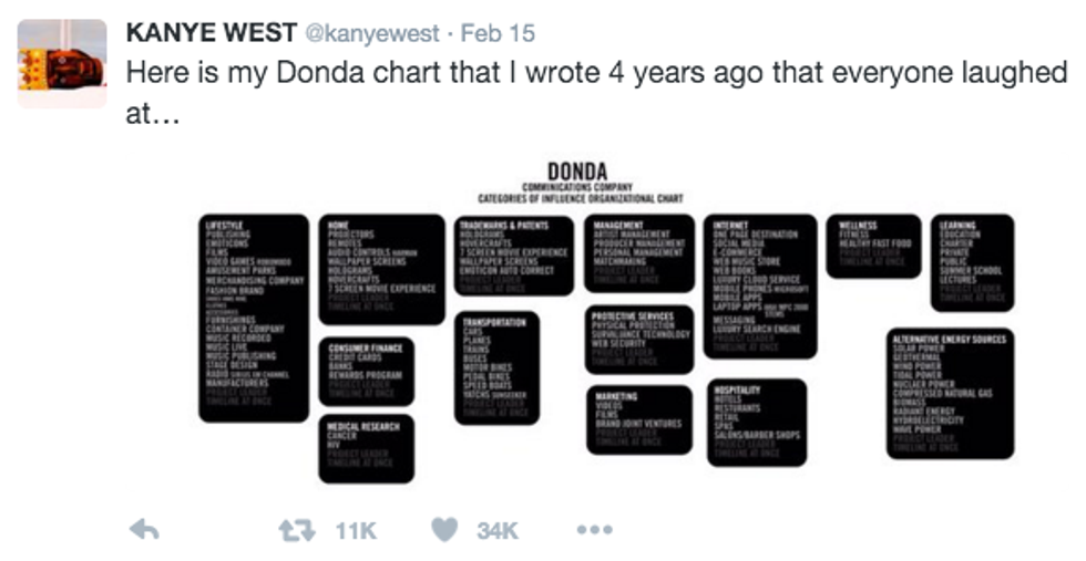 If you follow Kanye West on Twitter, you probably have noticed that he doesn't tweet very often. However, he has gone on several hilarious Twitter rants this month, bringing much joy to the Twitter universe. His tweets started in January when he announced that he was switching his album title from "Swish" to "Waves." Then, a couple of weeks later, he decided to change the album title again to "The Life of Pablo." In the midst of changing the album name to "Waves," Kanye because involved in a Twitter feud with Wiz Khalifa. To this day, I still have no idea how the feud started or what it was about. Kanye then announced that he was "53 million dollars in personal debt," and started asking Mark Zuckerberg for money. Yeezy has since tweeted many times, with confusing messages. The following is a list of Kanye's tweets that I will attempt to explain.