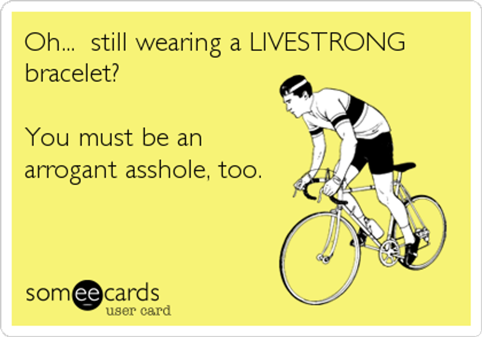 "So you support a f***ing cheater?" "Why in the world do you still wear that?" "Take that garbage off.".... just a few comments us LiveSTRONG bracelet wearers encounter on the occasion.