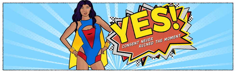 Consentress is where the sex positive aspect of the campaign really comes from and stands as the "mascot" of the campaign. She represents the sexuality of both men and women. By her being this confident, sexy superhero, it shows that that's alright for people to be confident with their bodies and sexuality.