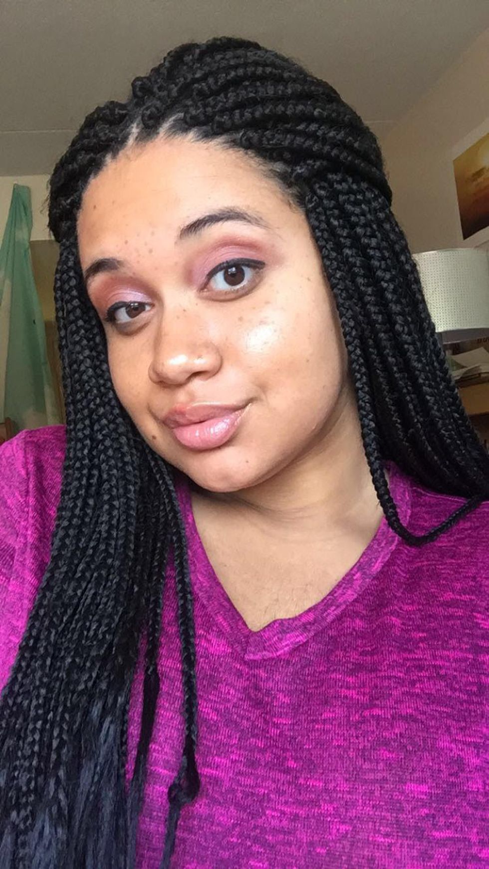 Answer: Sometimes I even forget I’m wearing these braids until one falls over my shoulder or gets stuck in the crook of my elbow. They are very comfortable. It didn’t start out this way though. When I first got them installed, the process itself was only painful during the detangling stages, but that is purely the faults of my hair and the tenderness of my scalp. You would think after all these years, my hair would know how to act when it’s time to detangle! Fortunately, I got them done by a super sweet incredibly talented fellow student, who made the entire experience ten times more enjoyable (SHU students, I would highly recommend her for anything hair related!). For the first few days, I woke up a few times each night when I would toss and turn on my pillow. Putting all of my hair up to shower was also a bit of a challenge because the braids closest to my face were tight. Still, it was not a constant pain, my head just needed some time to realize what the heck was going on. Now, I throw them up in every style I can!