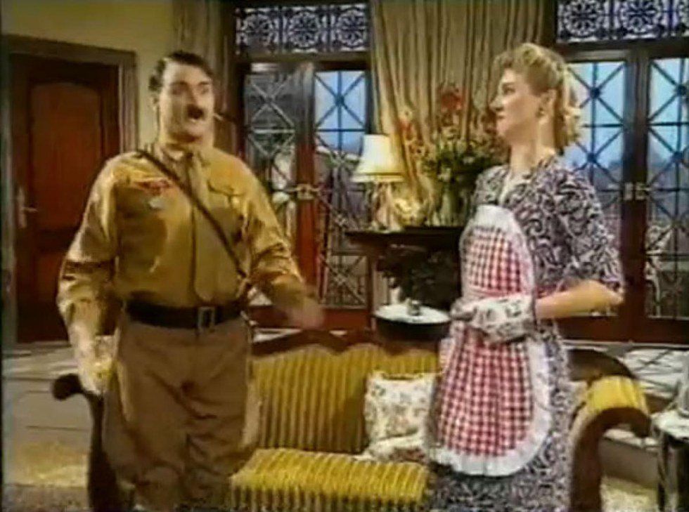 The show starts with the audience applauding the entrance of our main character, none other than the Fuhrer himself. There are quite a few things wrong with that. First off, a laugh track should be able to cheer on the entrance of perhaps the most hated man in existence, much less laugh at his jokes. It's for that reason that I hypothesize that the show was filmed in front of a live hostage audience. If they did, it is perhaps the most historically accurate thing the show did.