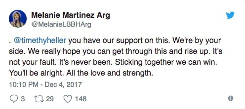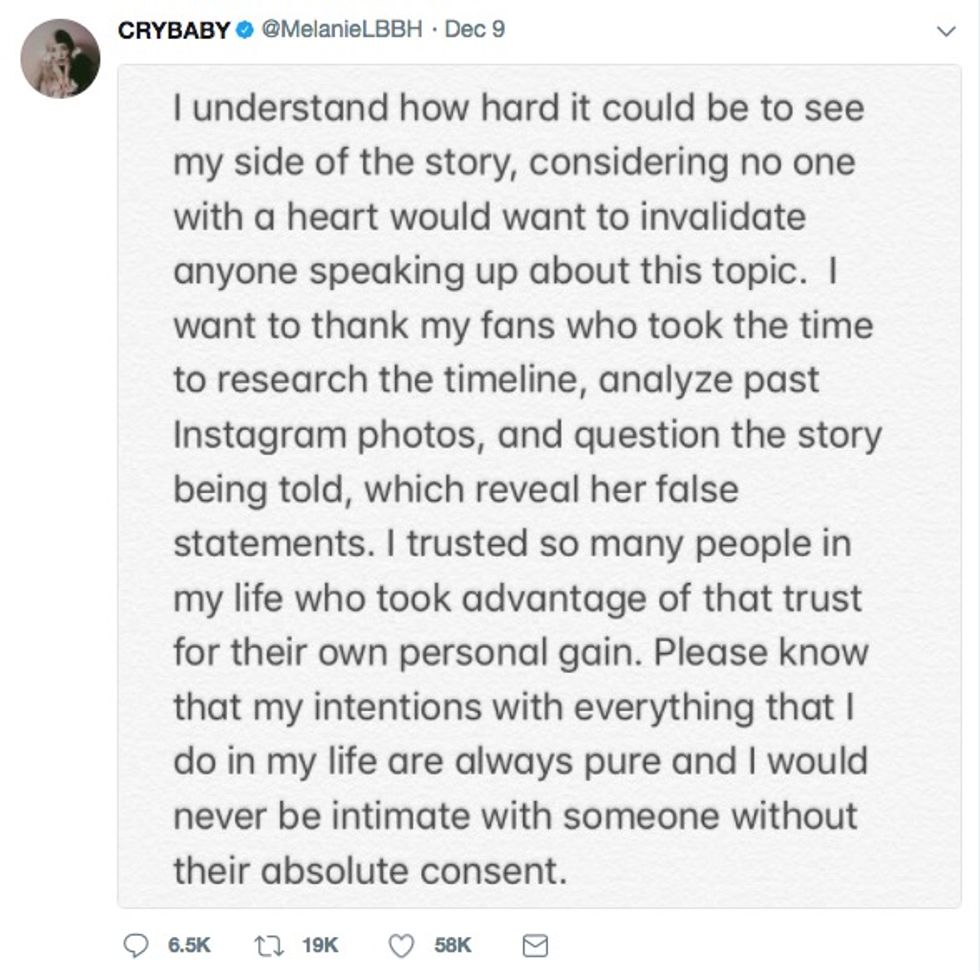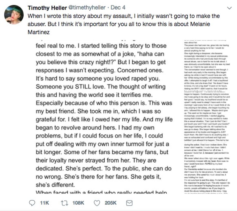 On December fourth, Timothy Heller tweeted a series of statements revealing that years ago, she had been raped by a close friend. That friend happened to be the well-known singer Melanie Martinez.