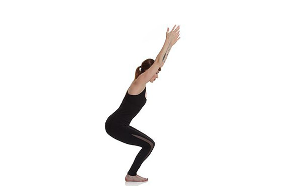 This pose improves your thighs and butt. Start with your feet together, toes forward and your arms at your sides. Inhale and raise your arms overhead with your palms face one another. Exhale and sit back about 45 degrees while keeping your knees behind your toes and your abs tight in order to support your back. Continue to face forward.