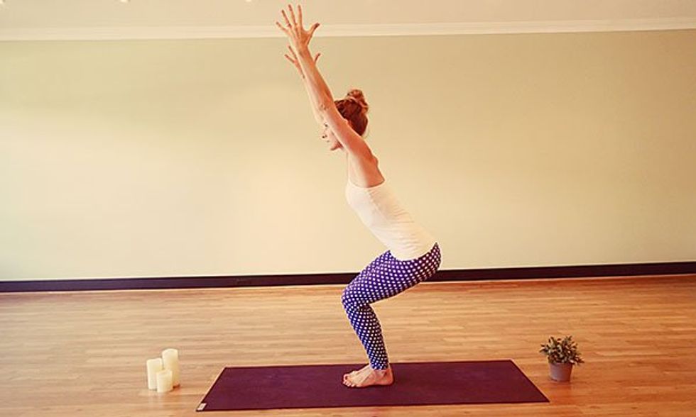 This pose builds energy in your quads and calf muscles to generate heat in those areas of your body. It challenges your mind to stay positive as the lower half of your body feels like it is on fire.