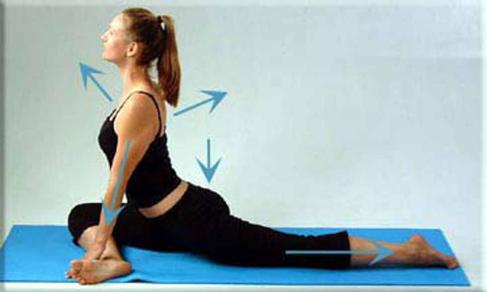 Start on all fours and slide one knee forward while pushing the opposite hip back. Slide your straight leg back, as far as comfortable. Your other leg should be perpendicular with the body. You may go down on to your forearms if you are comfortable there. You should feel a deep stretch in your glutes.