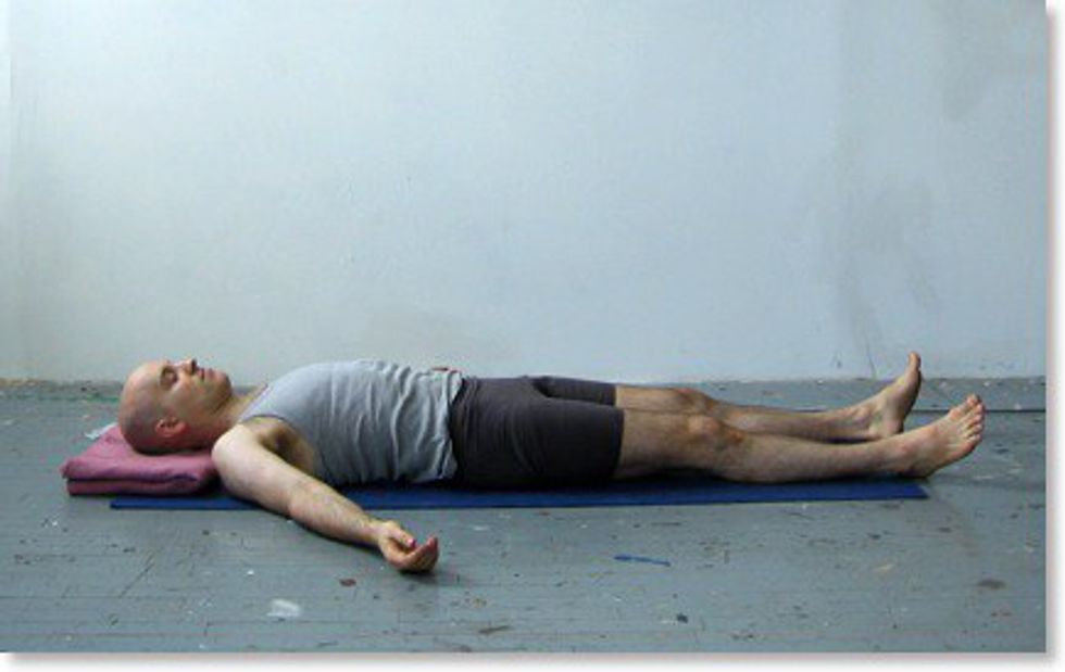 Lie on your back with your legs flopped open and your arms at your sides. Your palms should be facing up and your breathing should be natural. Allow your body to be heavy, and sink into the floor. Relax all the muscles in your body, release the tension. Breathing techniques and progressive muscle relaxation may be combined with Savasana. This pose is usually done last in the sequence.