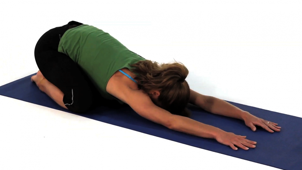 Begin in a table top position, on your hands and knees. Spread your knees wide apart and keep the insides of your feet together. Depending on chest size, some may need to spread their knees even farther apart. Fall forward placing your torso in between your thighs, with your arms stretched forward. You will feel a stretch in your hips, thighs, and ankles.