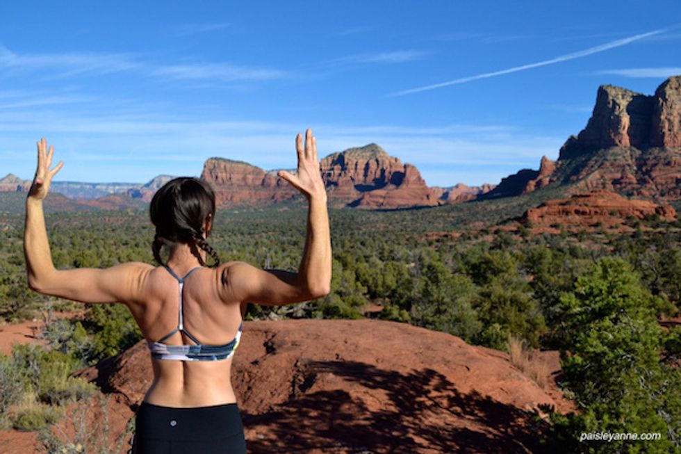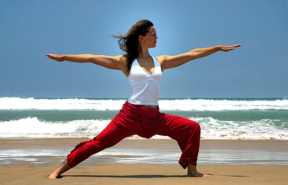 Bend it like Beckham for some serious upper body TLC. Sometimes stretching is all it takes to improve your day! Remember to take a bend on both sides, holding the pose for 10 seconds or more.4. Warrior II