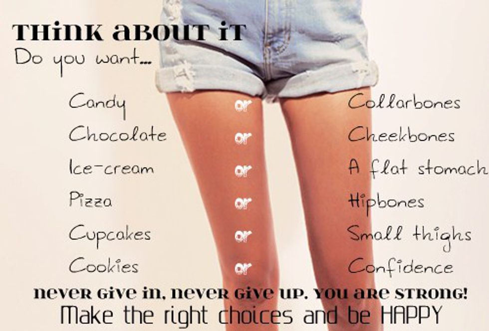 I remember when I was eleven years old, one of the girls in my class stood up in the cafeteria and started reading the calorie information on all of the food in my lunchbox. She then told me that if I wanted to eat that, I needed to make myself sick after, or else I would get fat. Being exposed to those ideals at such a young age made me realize how scary it is growing up, and how incredibly false they really are. I never really was confident in myself because of the way my friends talked about beauty, and by the way the media perceived what was really "beautiful." I was surrounded by scary and unsettling images that would make me feel as if I needed to starve myself instead of actually exercising and being happy. I had to realize that I was just a kid, and I needed to focus on my health and not these ideas of "beauty."My experience at an all-girls school gave me an interesting perspective into the world of unrealistic expectations. I constantly saw girls walk by me in the cafeteria with clean, white styrofoam trays with nothing but a cheese stick on them, and girls waiting in line for the bathroom, five minutes after eating barely anything.I remember countless times being in the bathroom, hearing girls making themselves sick because they thought they ate too much. Watching them, I thought this was completely normal. I thought that the idea of wanting so desperately to be a size zero was a common goal of all girls, and it wasn't unhealthy to think that way.