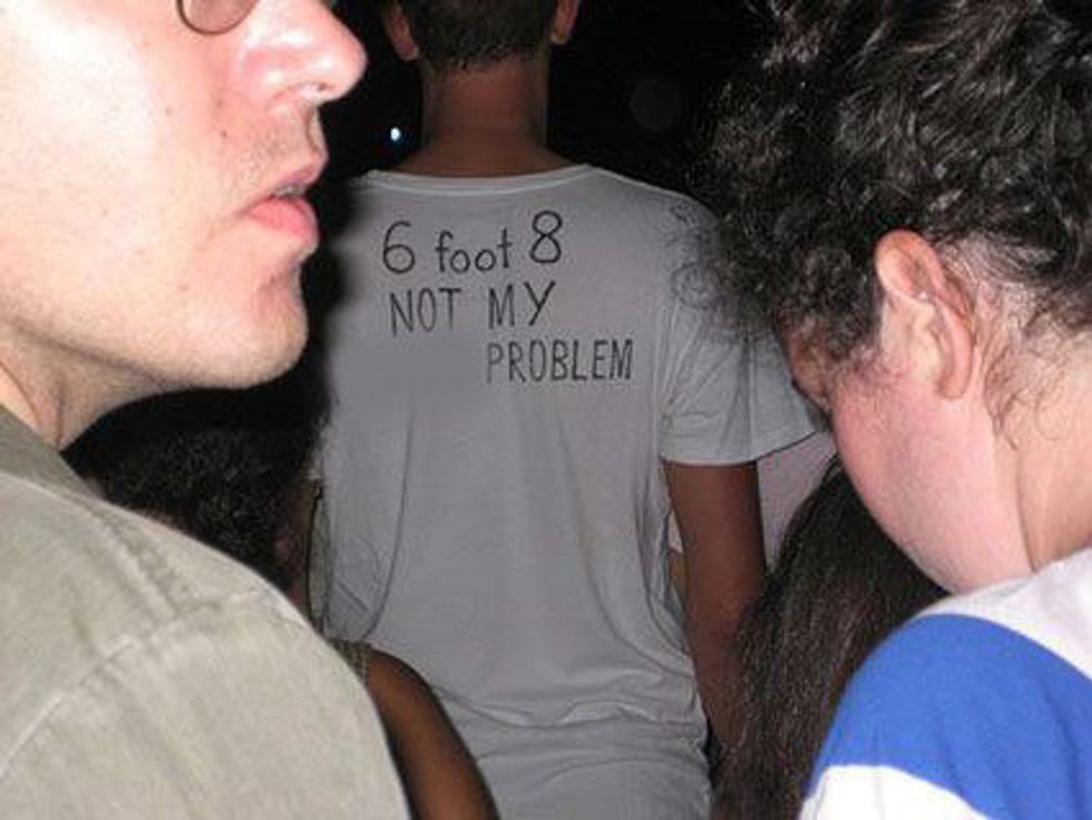 For example in church or a movie theatre. Especially if there is more than one tall person with you, it feels like you’ve just built a brick wall for the people behind you. To the people who have been on the short side of this, we feel bad about it and there is nothing we can do, maybe get a box or phone book to boost yourself up so you can see over us.