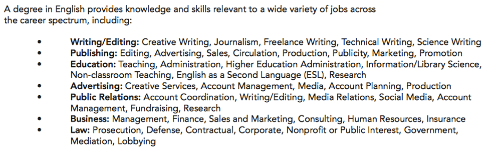 A few weeks ago, I sat hopelessly in CCE waiting for some divine intervention -- I know this sounds dramatic, but I’m not sure how else to explain my findings. Peeking out of a clear case in front of me was a sheet that read, “What can you do with a degree in English?” For those of you who spent years telling me my options were limited, I would like you to please step away from your problem set and take a moment to read the following: