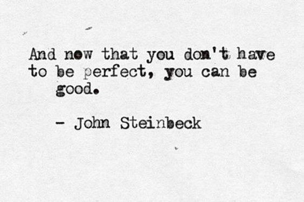 We all have room for improvement. Instead of striving for an unrealistic standard of perfection and moral righteousness, our souls will thrive once we accept that by nature, human beings are imperfect. At the end of East of Eden by John Steinbeck (an amazing novel), one character, Lee, says "And now that you don't have to be perfect, you can be good." Perfection is an incredible concept...but to strive for something so complex and this idea of complete purity is complete bull. This idealism leads to pain, insecurity, judgment, and depression. People who work only in the name of perfection cannot be good. We are all sinners, and we can't pretend otherwise. Goodness, on the other hand, comes from redemption. We can redeem ourselves through owning up to our wrongdoings, learning, and trying harder every day.