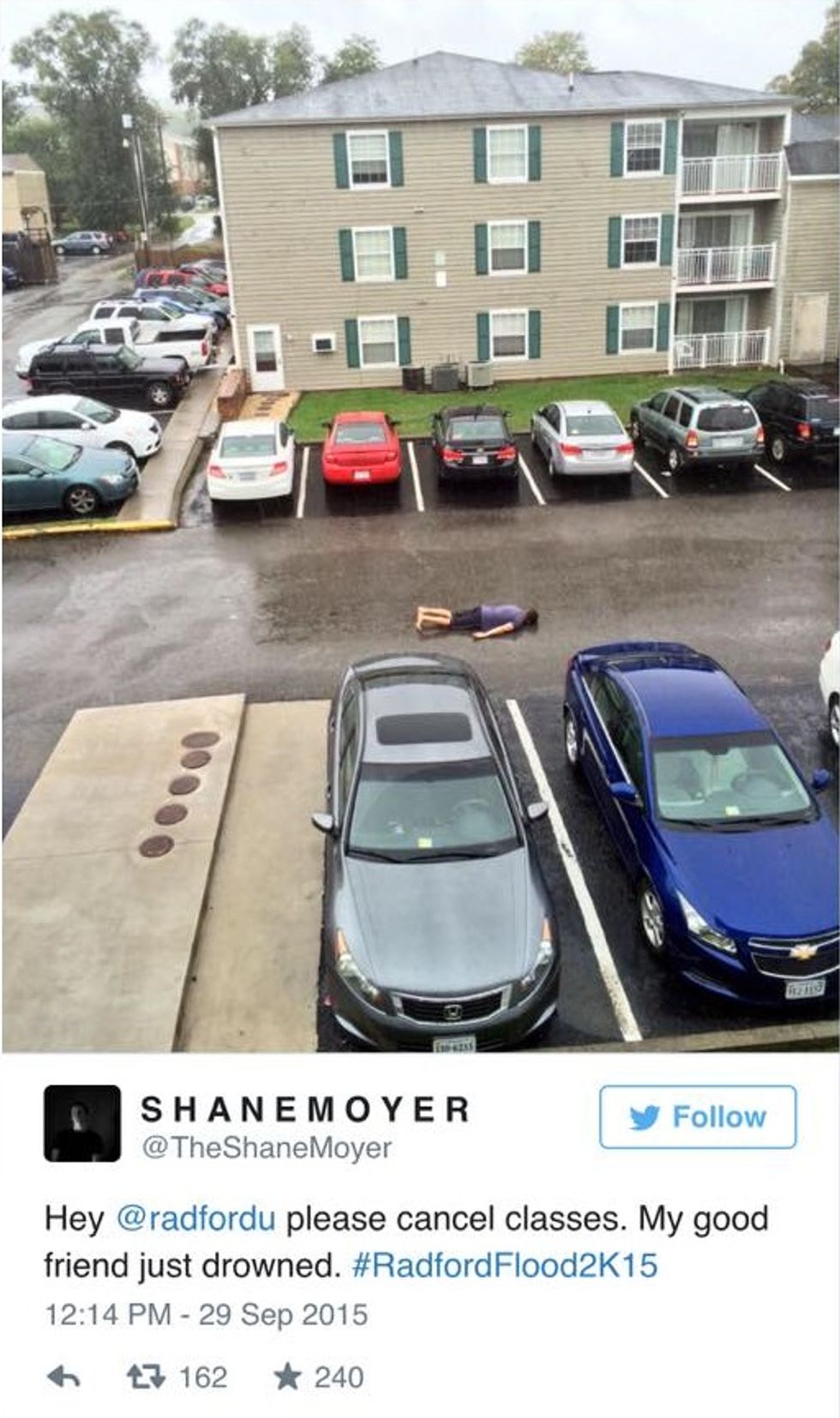 It's safe to say that the weather in Radford reminds us of the apocalypse. Hot and sunny one day, 3 feet of snow the next, and to end the week with Noah's Arc worthy floods. No matter what, though, class is not canceled, will never be canceled, enjoy that walk to class in this mess.