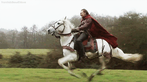 OK, there is so much to say about this GIF: Hiddleston is pinching with his knees and his toes are pointing down when they should be pointing up. And God forbid the horse stopped -- he would fly right over the horse's head. Who taught this guy how to fake ride? I'd like a word.