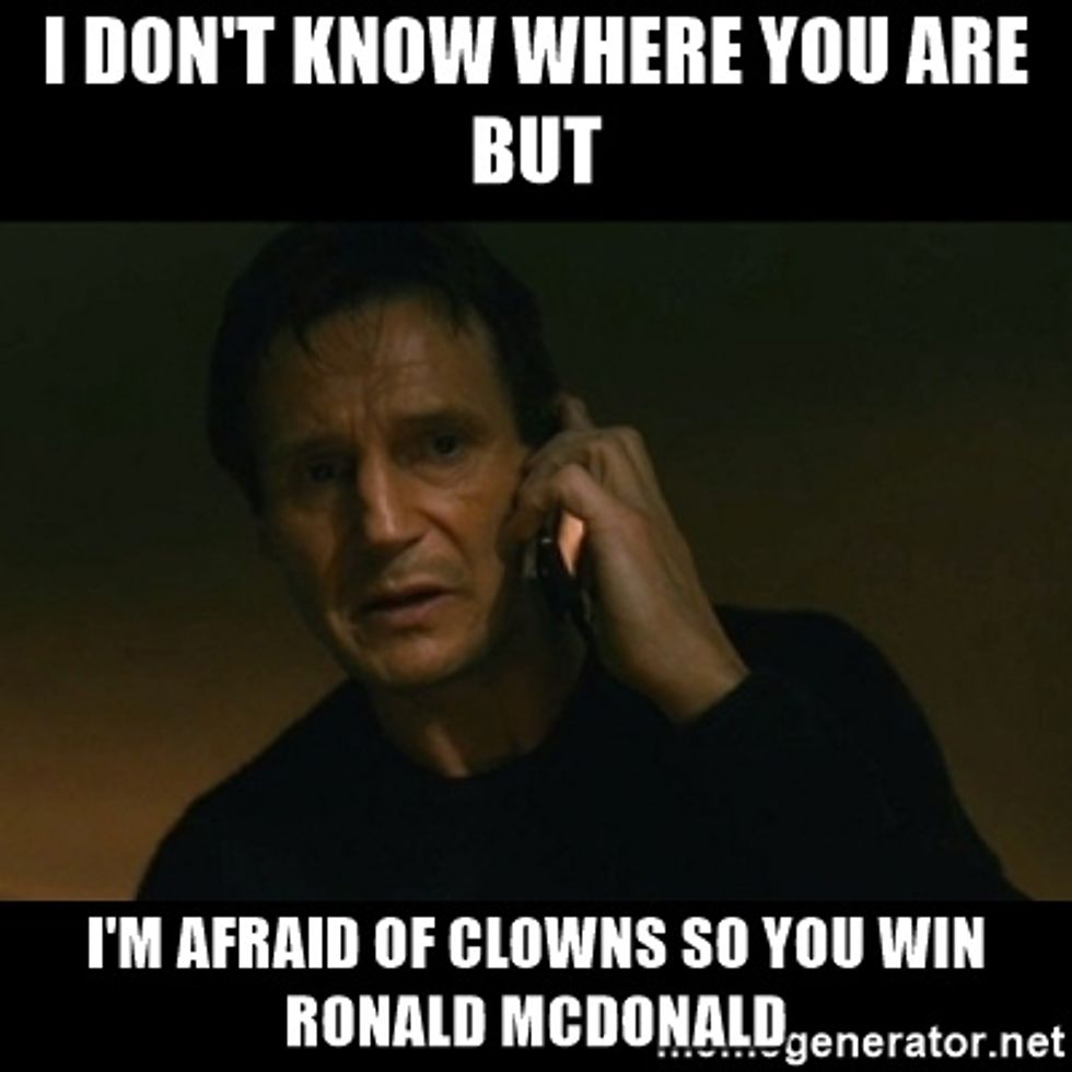 Anyone who knows me is aware of the fact that I hate clowns with a burning passion. There is something about them that gives me the chills and I just have an un-explainable fear of them. Recently there have been sightings in several states of people dressing up as clowns in order to scare the general public. That's when you've lost your mind! I have no idea what would possess a person to think it is a good idea to dress up as a clown and run around terrorizing people -- or why they would think it's funny. The fear of clowns is something that has been made fun of in media in the past but it is in fact a very real phobia.