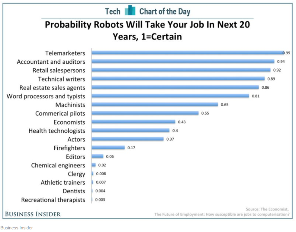 While robots taking over the world is a pretty extreme topic to think about; robots taking over jobs shouldn’t be. Business Insider compiled the jobs most likely to be replaced by robots in the next 20 years.
