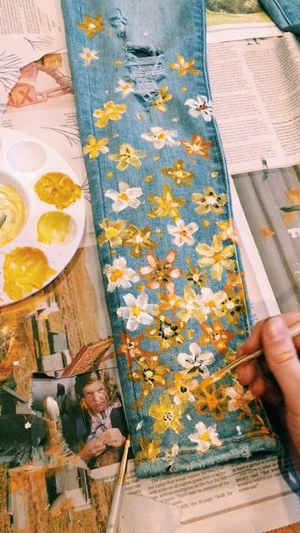 These jeans are my favorite inspiration. They took a regular pair of jeans and made them perfect for the summer. You can use any color you want and make any design. Fabric paint is best for more of a vibrant color, but acrylics have a larger range of colors and you can add textile medium into your acrylics to make sure it lasts. This is a perfect way to spice up your outfit and make it more altered to your taste.