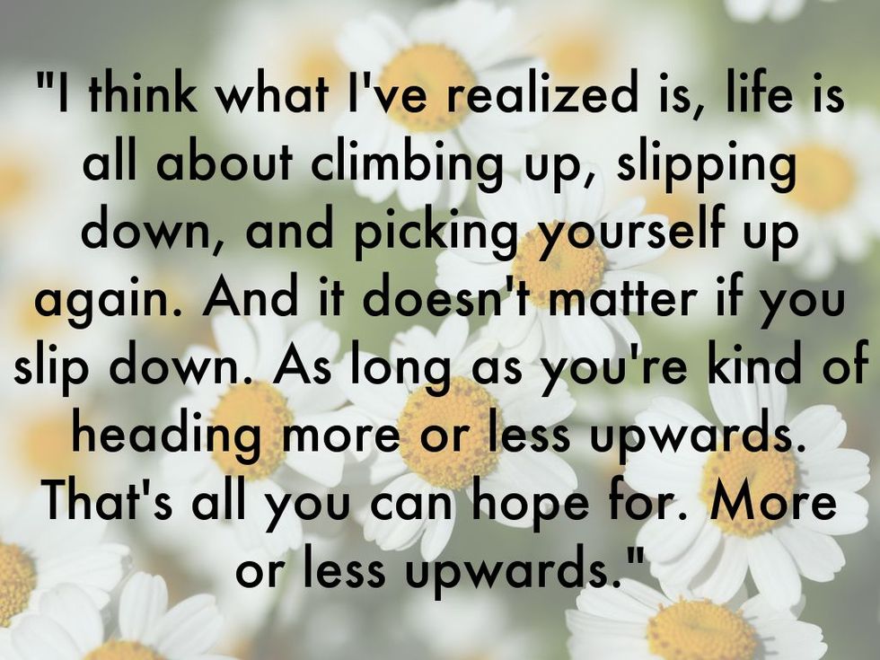 5. “I think what I’ve realized is, life is all about climbing up, slipping down, and picking yourself up again. And it doesn’t matter if you slip down. As long as you’re kind of heading more or less upwards. That’s all you can hope for. More or less upwards.” - Sophie Kinsella, "Finding Audrey"