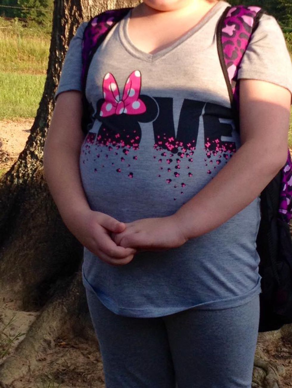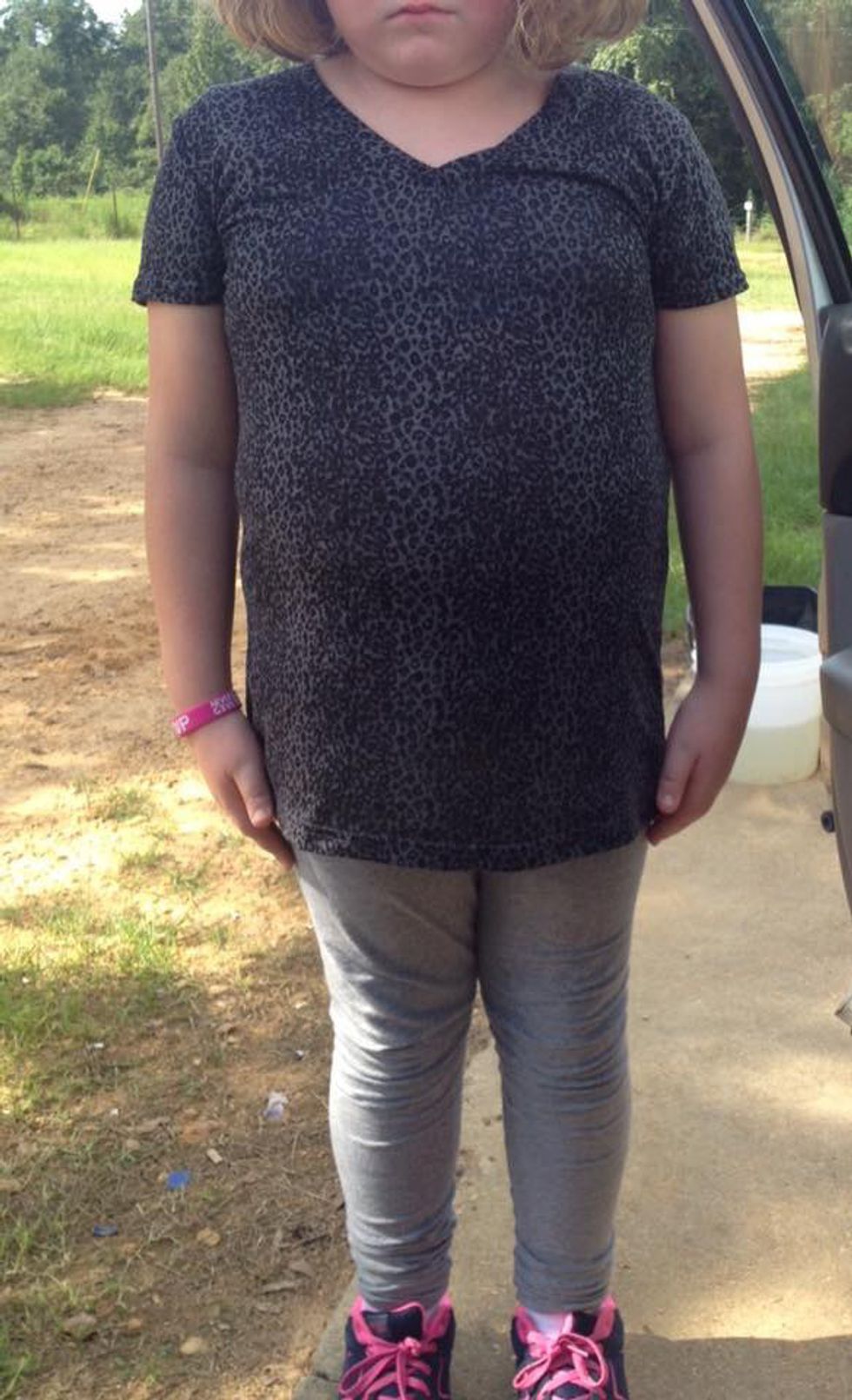 Ask yourself, do you find anything wrong with this young girl's clothing? Typically, dress code policies enforce that a student has AT LEAST a 3-inch sleeve, fingertip length bottoms, and shirts that do not expose any middrift at all. However, the school felt as though the girl's shirt was too "form-fitting" due to her size.