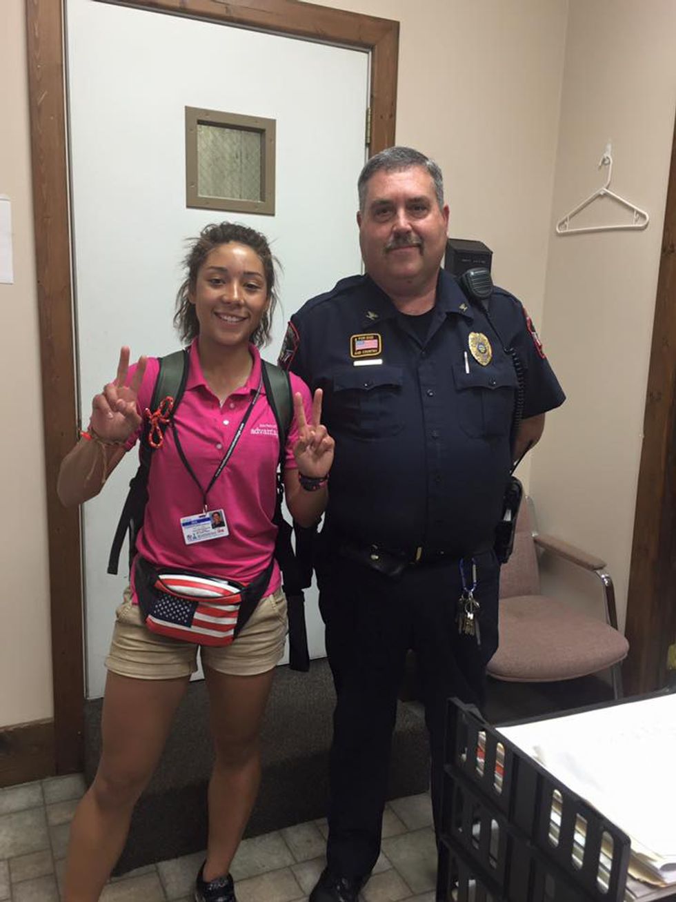 After some easy Facebook digging, I found pictures of the girl standing next to a local police officer. Only she wasn't being cuffed or charged with human trafficking-- she was smiling at the camera just like she did in the picture that was used to falsely label her as a nefarious child-stealer.