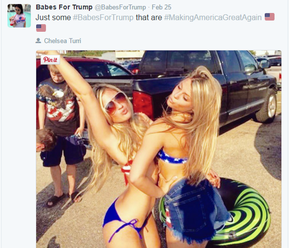 I am under no means trying to bash the women featured on the Babes for Trump accounts. If they are confident enough with their bodies to submit such risque photos then kudos to them! You go girls! I would just like to see more substantial reasoning behind their endorsement of Donald. I would suggest accompanying the tweets with a reason they support him, like his views on a popular political issue. Maybe even showing more faces and less rear ends. The last thing we need in this election is another slap in the face to our political system.