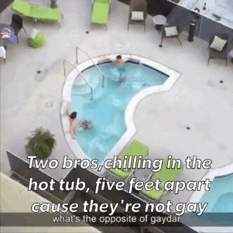 Libras are known to be very loving and affectionate, but they have a hard time expressing their feelings and can come off as hard to get. They lack communication skills and may push people away... in this case, literally. "2 bros, chillin' in a hottub, 5 feet apart because they're not gay!" This just felt like the Libra vine for this.