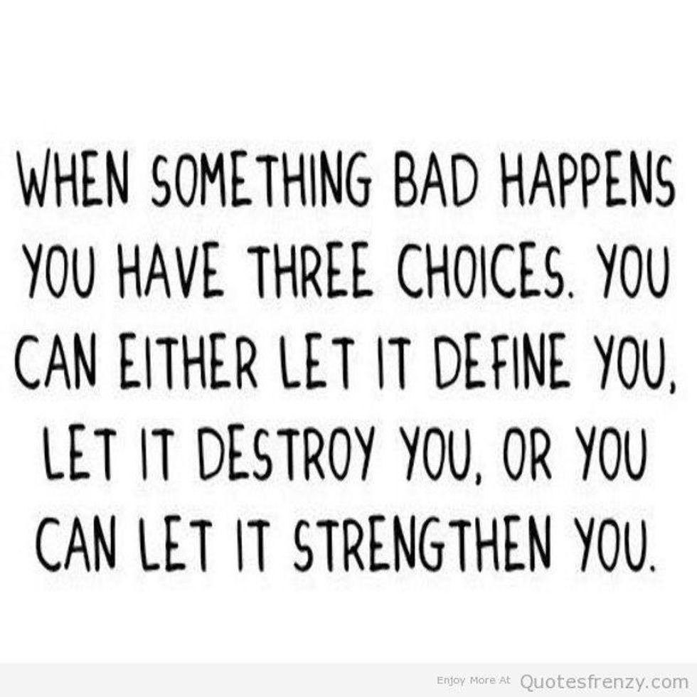Recently, I have been letting people and events decide how my day goes. I let myself sit there thinking about everything that is going wrong instead of saying, "Yep, this sucks but you know what, I am going to be O.K." So now I have decided to take control. I am no longer giving people and events any control over me. Sure, I will feel frustrated sometimes. I will feel angry sometimes. I will feel sad sometimes. But only sometimes. I won't let 5 minutes or 30 minutes or even one hour out of my day decide how the rest of it will go.